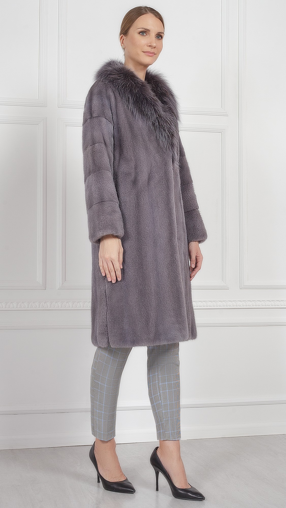 Шуба из меха норки, отделка рысь